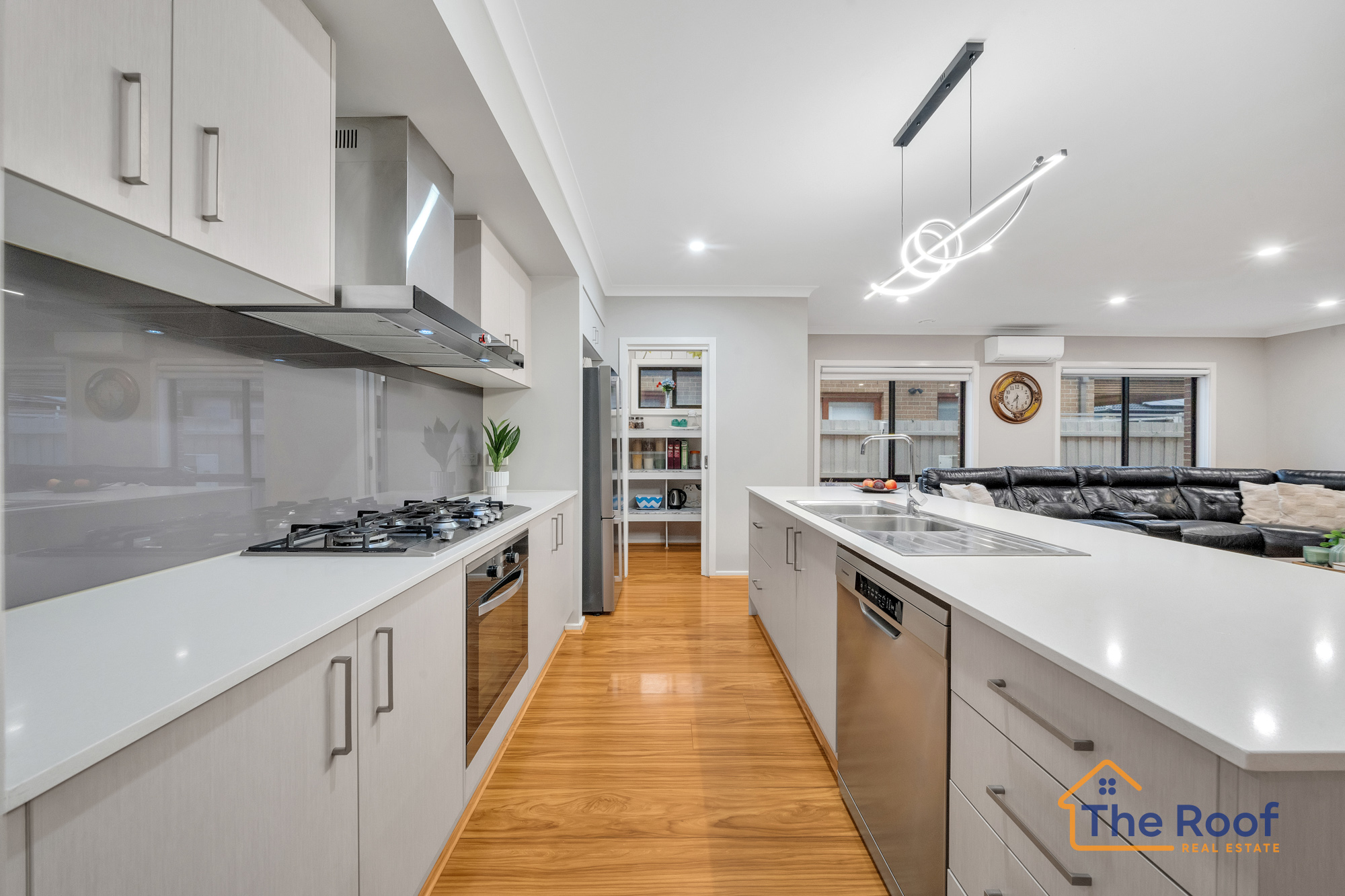 # Large professional chef’s kitchen, complemented by a dedicated walk-in pantry features premium 900mm stainless steel appliances and a stylish glass splash back