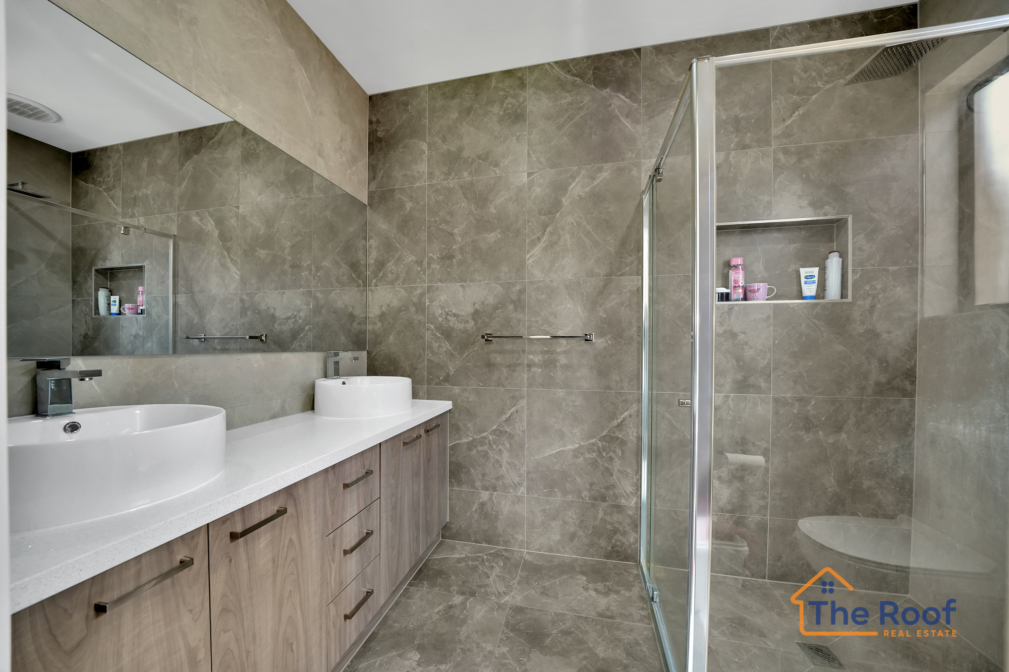 • Double vanity with Stylus tapware Ceramic tapware, shower head and frameless extended shower
